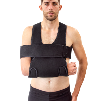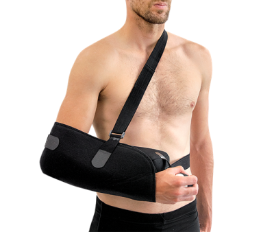 Από βαμβακερό ύφασμα με ρυθμιζόμενη τιράντα ανάρτησης και προστατευτικό αφρώδες μαξιλάρι ώμου. Ανακουφίζει και κρατά τον αγκώνα σε γωνία 90°. Υποδοχή για τον αντίχειρα. Πλένεται.