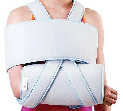 Από βαμβακερό ύφασμα με ρυθμιζόμενη τιράντα ανάρτησης και προστατευτικό αφρώδες μαξιλάρι ώμου. Ανακουφίζει και κρατά τον αγκώνα σε γωνία 90°. Υποδοχή για τον αντίχειρα. Πλένεται.