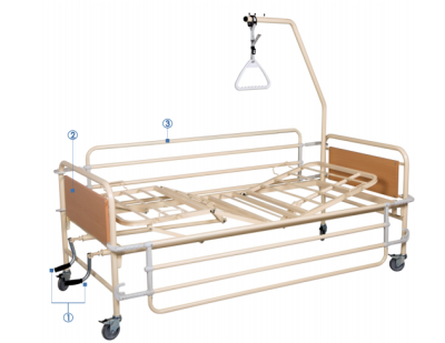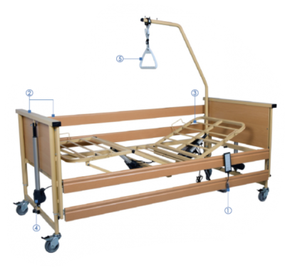 Πολύσπαστη ηλεκτρική κλίνη υψηλών προδιαγραφών.Με επένδυση ξύλου και ενισχυμένο σωμιέ από εύκαμπτες ανθεκτικές μεταλλικές πλάκες στήριξης.Διπλά πλαϊνά ασφαλείας και ρυθμίσεις ύψους ηλεκτρικά.Με λαβή ανάρτησης ,στρώμα και 4 τροχούς.