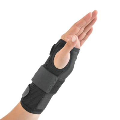 Νάρθηκας από πλαστικό υλικό, με οπές αερισμού. Αυτοκόλλητος και ρυθμιζόμενος ιμάντας περίδεσης για σωστή εφαρμογή. Εσωτερικά, ο νάρθηκας διαθέτει υφασμάτινο γάντι για την προστασία του δέρματος. Διατίθεται σε αριστερό