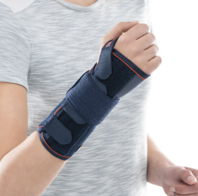 Νάρθηκας από πλαστικό υλικό, με οπές αερισμού. Αυτοκόλλητος και ρυθμιζόμενος ιμάντας περίδεσης για σωστή εφαρμογή. Εσωτερικά, ο νάρθηκας διαθέτει υφασμάτινο γάντι για την προστασία του δέρματος. Διατίθεται σε αριστερό